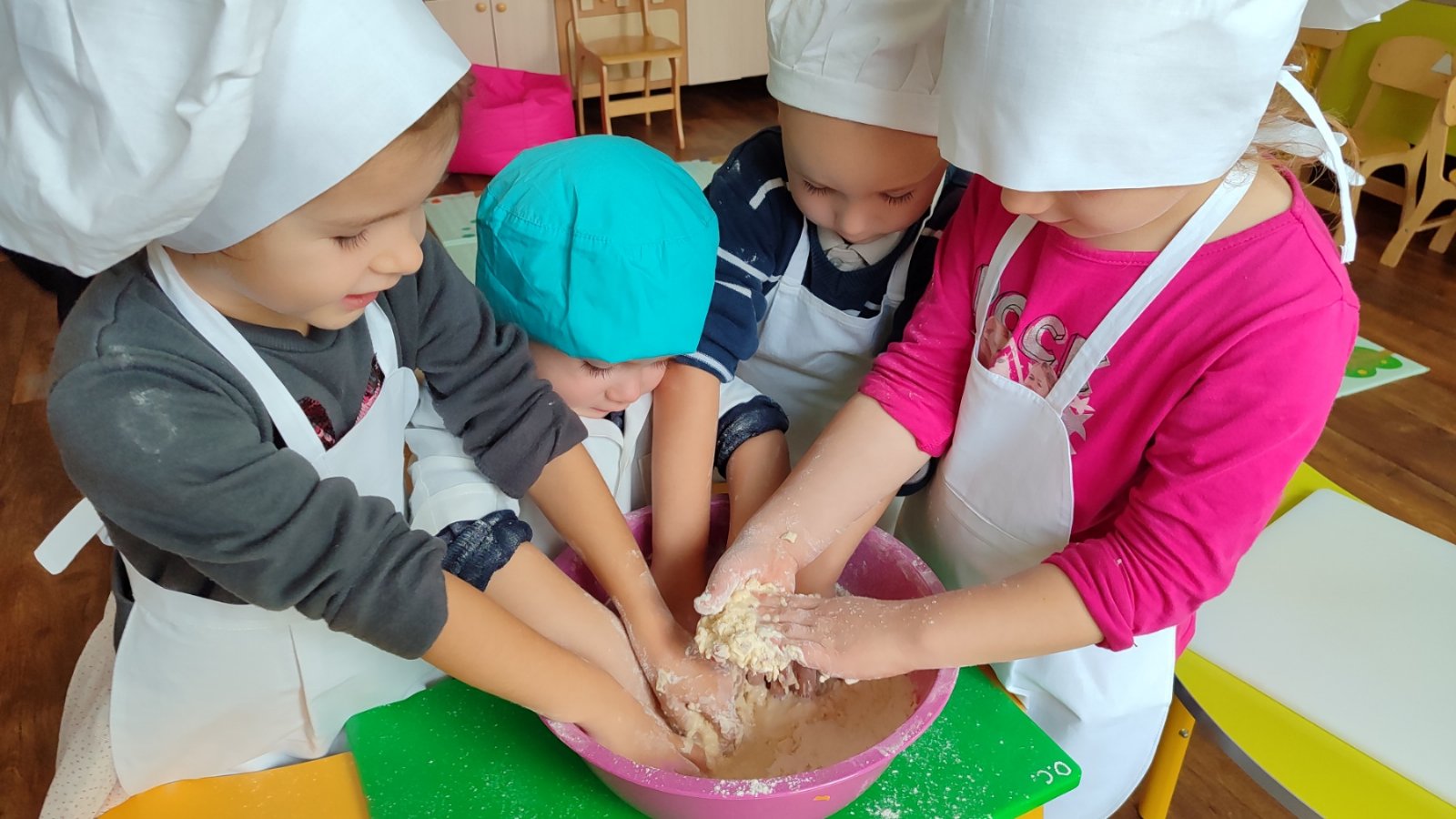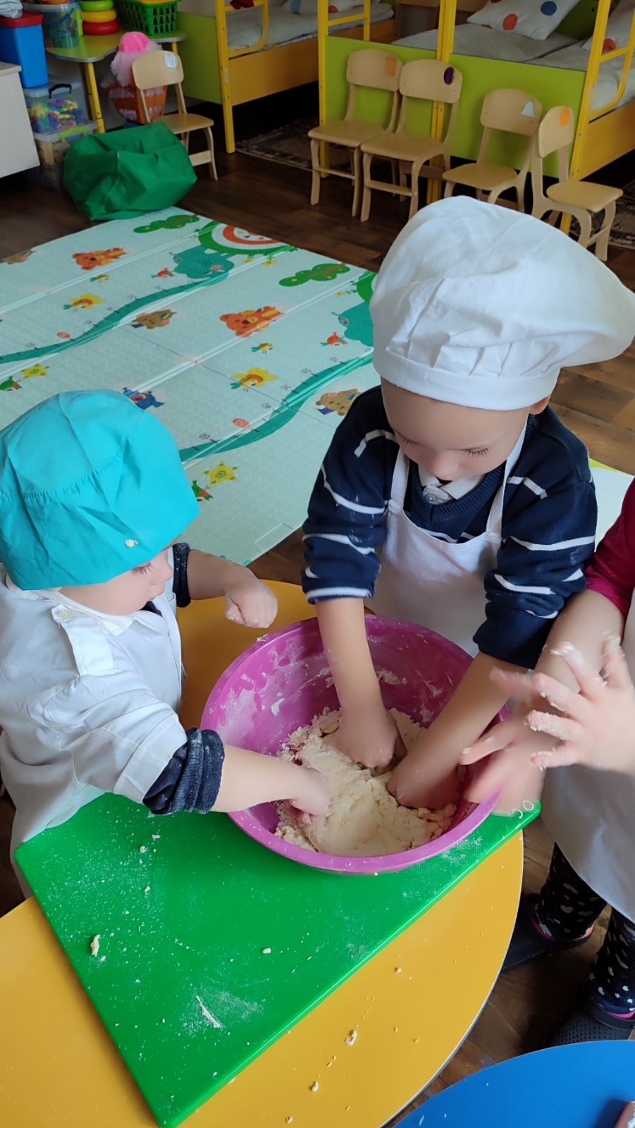 Перемішавши борошно, сіль, цукор трішки любові та тепла отримали тісто. Взявши тісто в маленькі рученята діти місили його, ліпили з нього маленькі хлібні вироби – булочки, рогалики.
